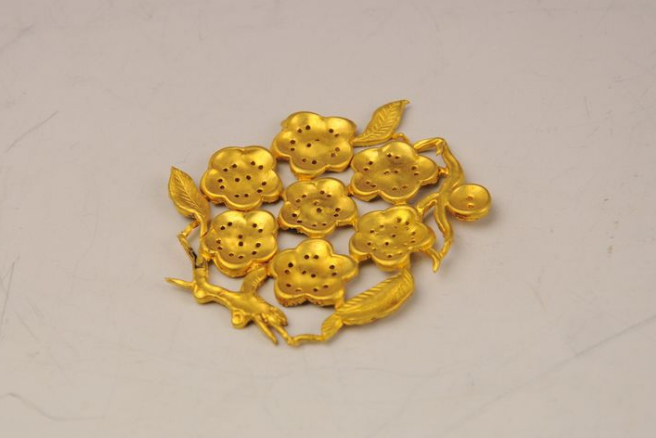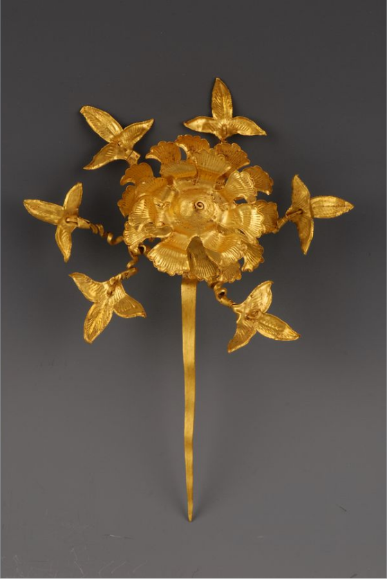 簪花在唐代成为社会风尚。初唐时期,人们喜欢在头上用鲜艳的小花加以点缀,到了中晚期则流行插诸如牡丹、芍药之类的大朵花。唐代周昉所绘《簪花仕女图》中仕女披着薄纱,飘逸轻盈,眉如远黛,腮若云霞,簪花插在高高的髻上,分别簪了牡丹花、海棠花、荷花、芍药花。