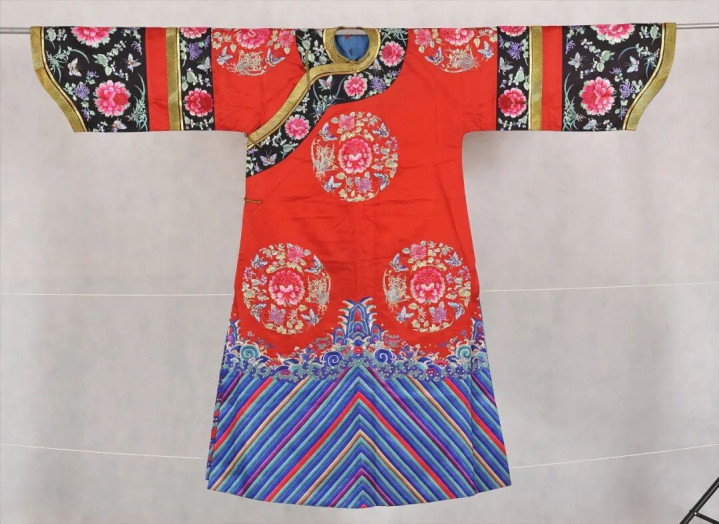 吉服的颜色、纹样皆寓意吉祥。红色为主调,象征喜庆;装饰纹样多为蝙蝠(福)、鹿(禄)、桃(寿)等谐音图案,或直接绣上“福”“寿”字样,展现民间对新年的美好祈愿。
