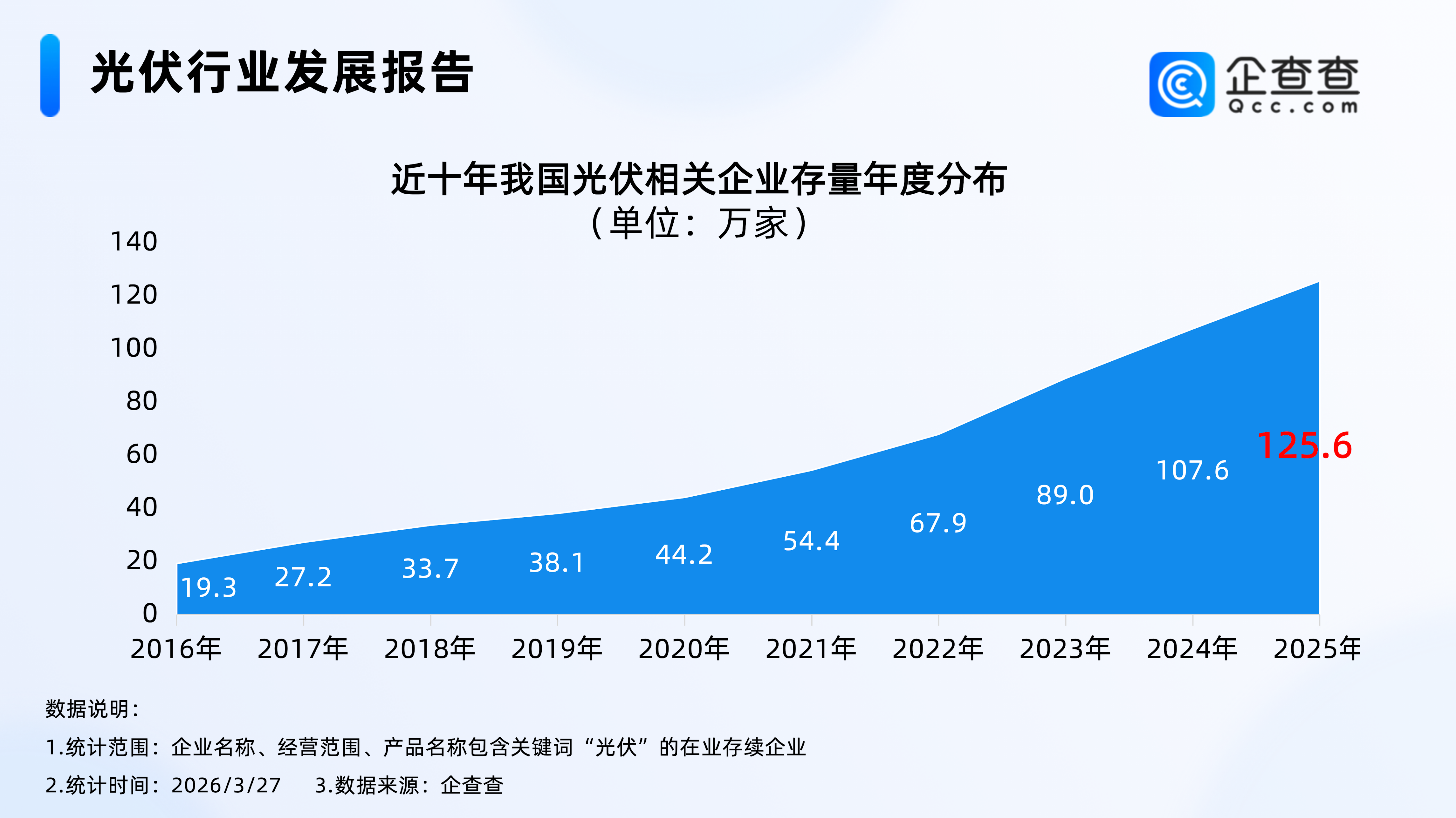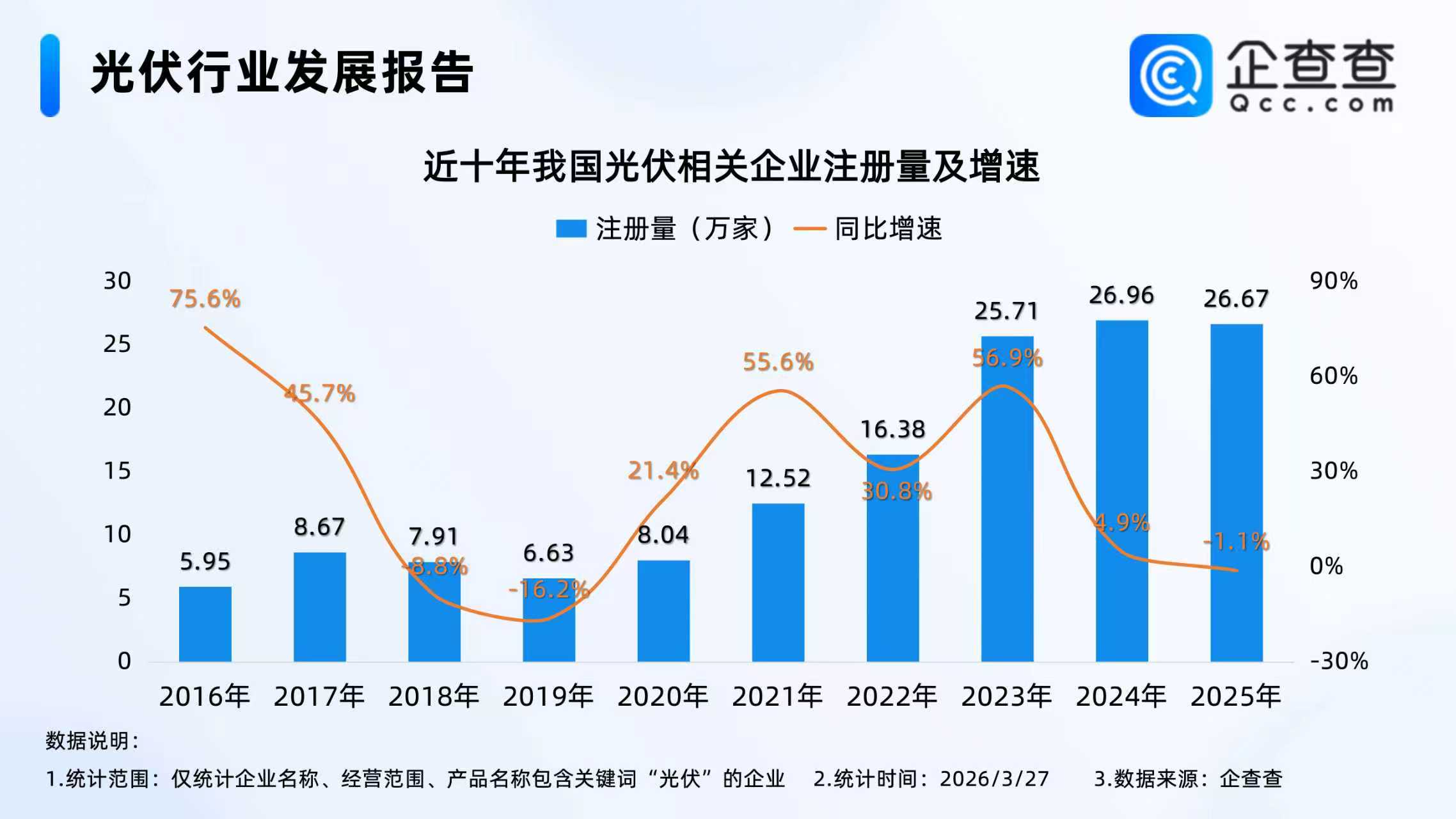 企查查数据显示,截至3月27日,我国现存129.1万家光伏相关企业。2023年以来,我国光伏相关企业每年注册量均保持在25万家以上;2025年全年,我国累计注册26.7万家光伏相关企业,区域分布上,华东地区2025年相关企业注册量最多,占比34.7%;截至3月27日,2026年我国已注册5.05万家光伏相关企业。
