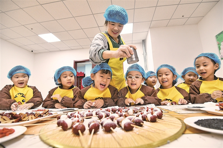 山东省乐陵市一家幼儿园里,小朋友在老师的指导下制作面食。新华社发