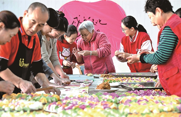 河北省石家庄市新华区一家养老公寓里,社区志愿者与老人一起包饺子。新华社发